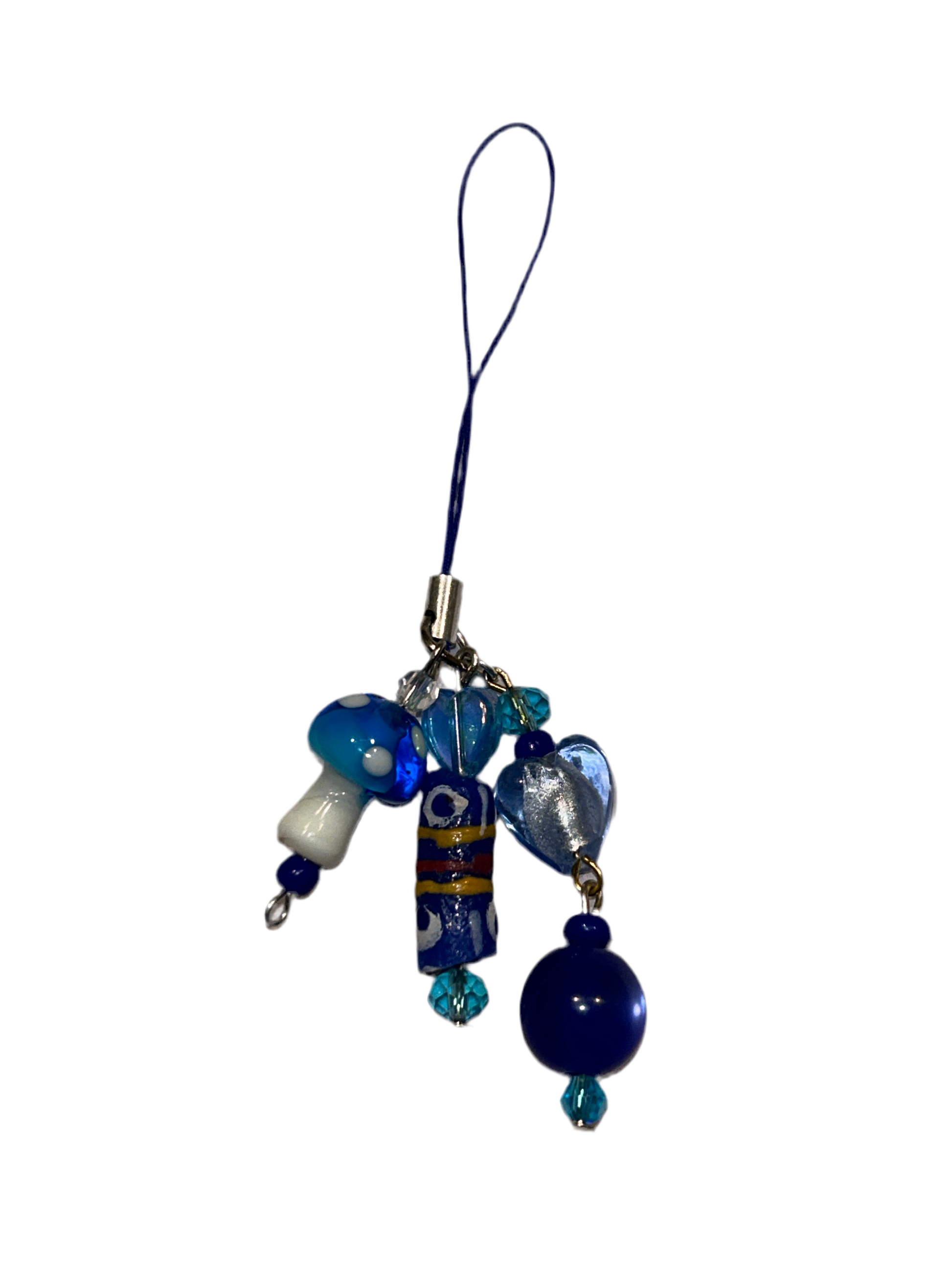 Cute beaded phone charm. Made with various beads including shells, glass beads, fino fruits and plastic beads / charms.