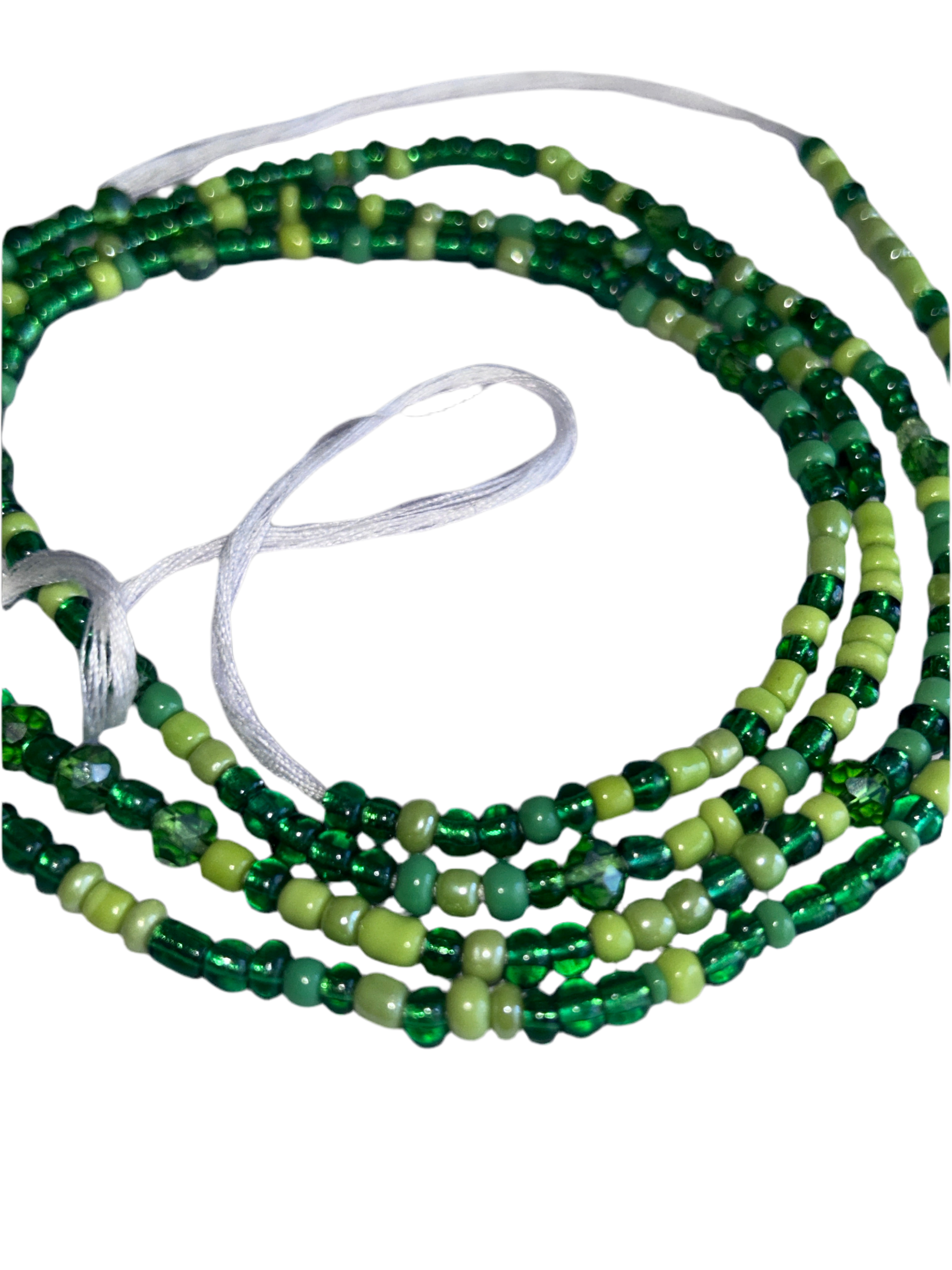A mix of light & dark green 4mm glass beads with crystal green beads on cotton thread