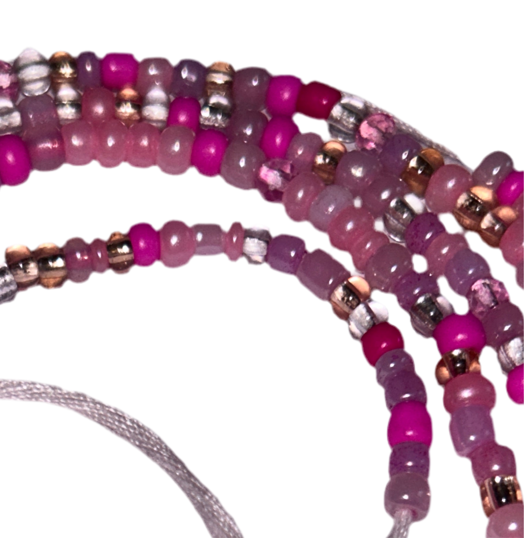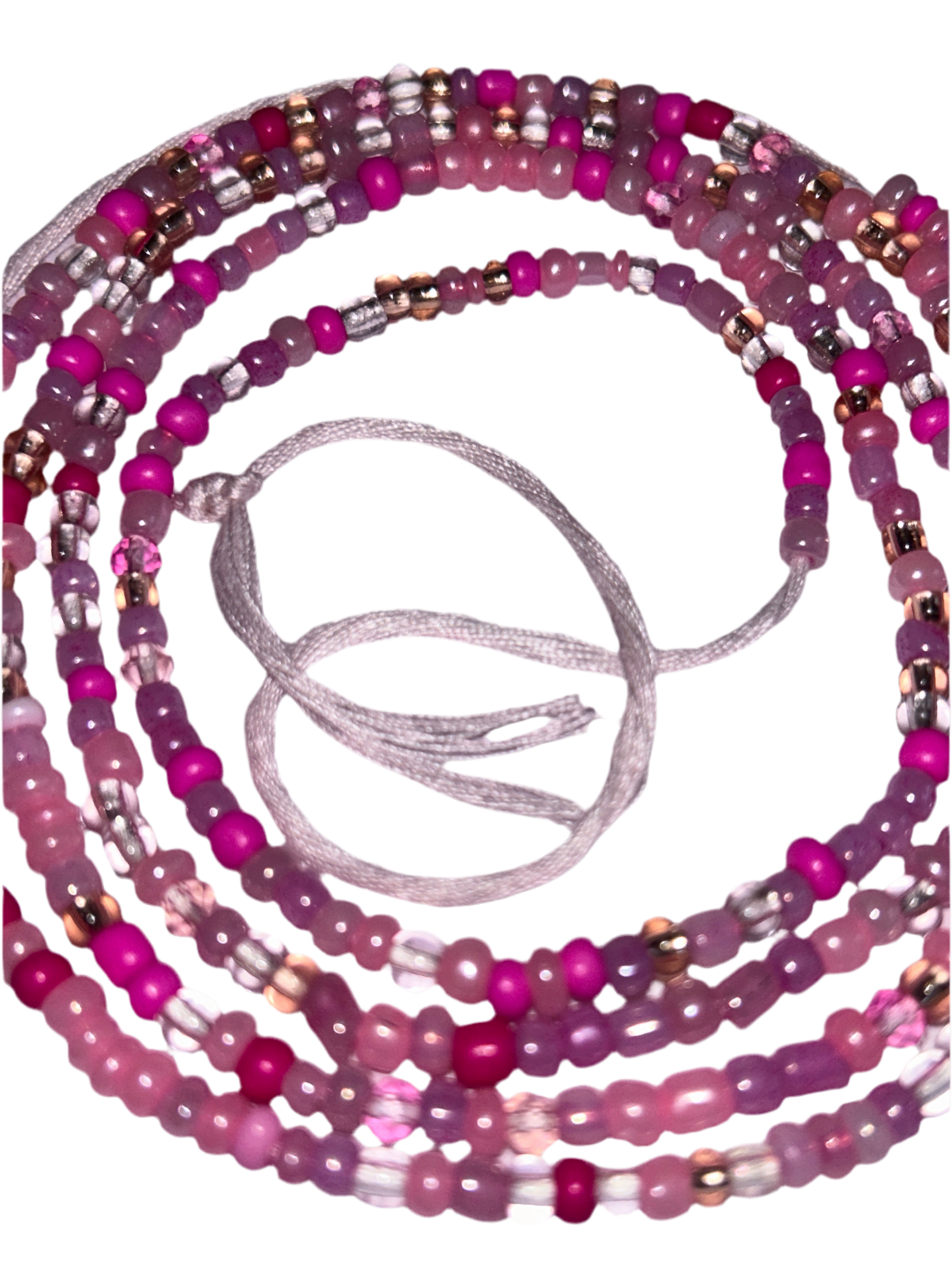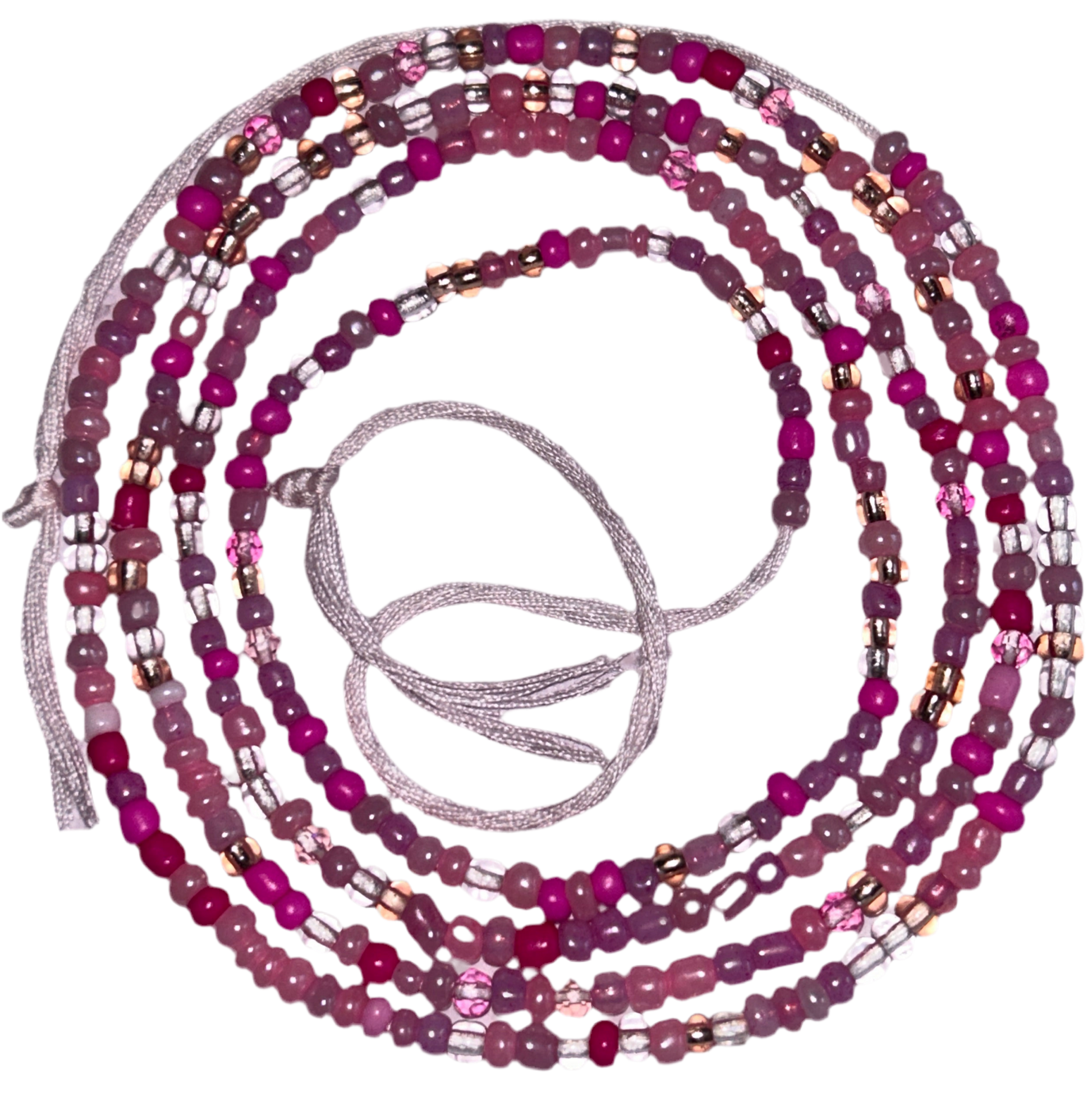 Please note that the beads may not be exactly as shown in the picture, as they are custom-made. The pink beads may fade over time and will alter the overall colour of the waistbeads.