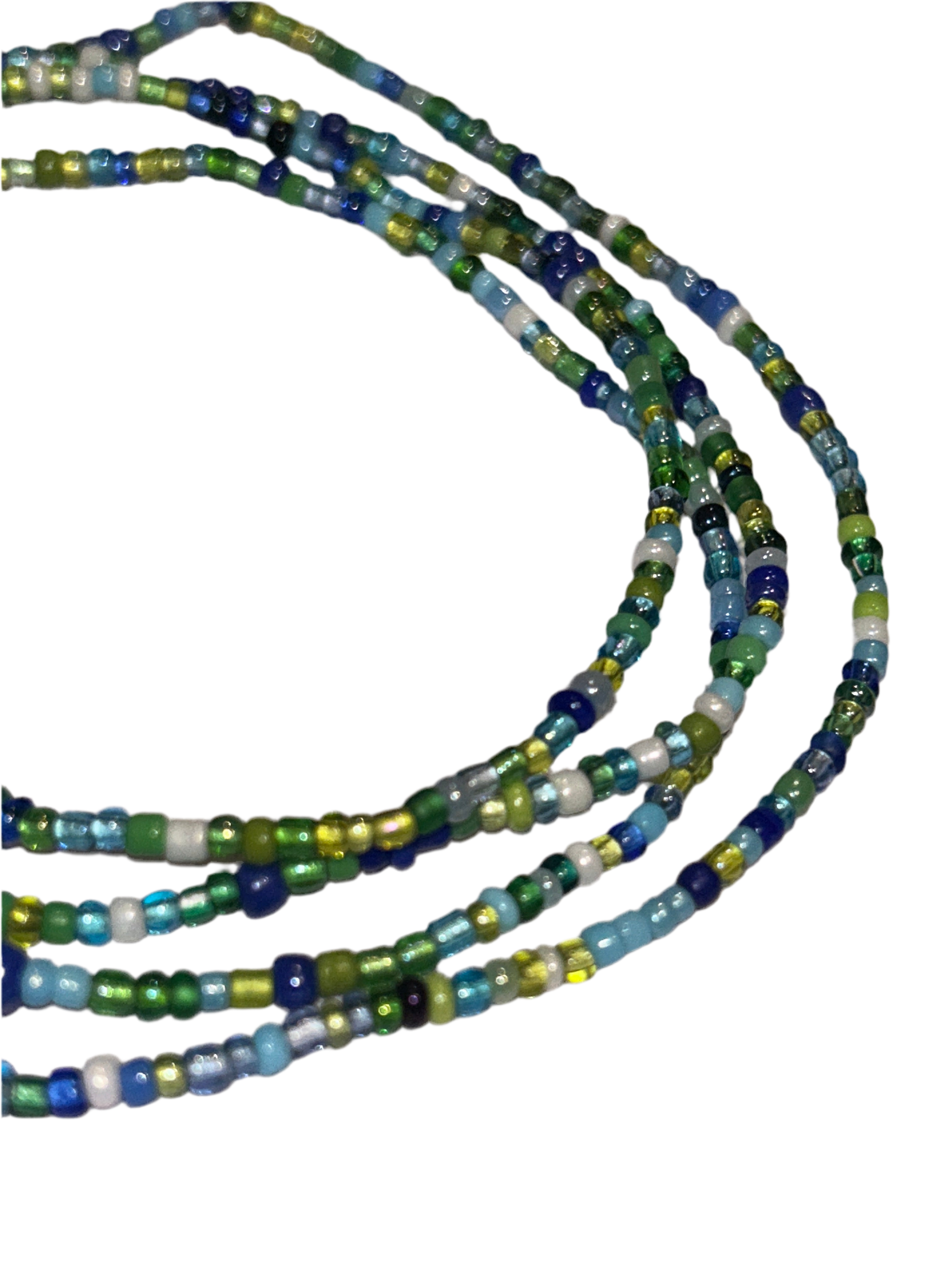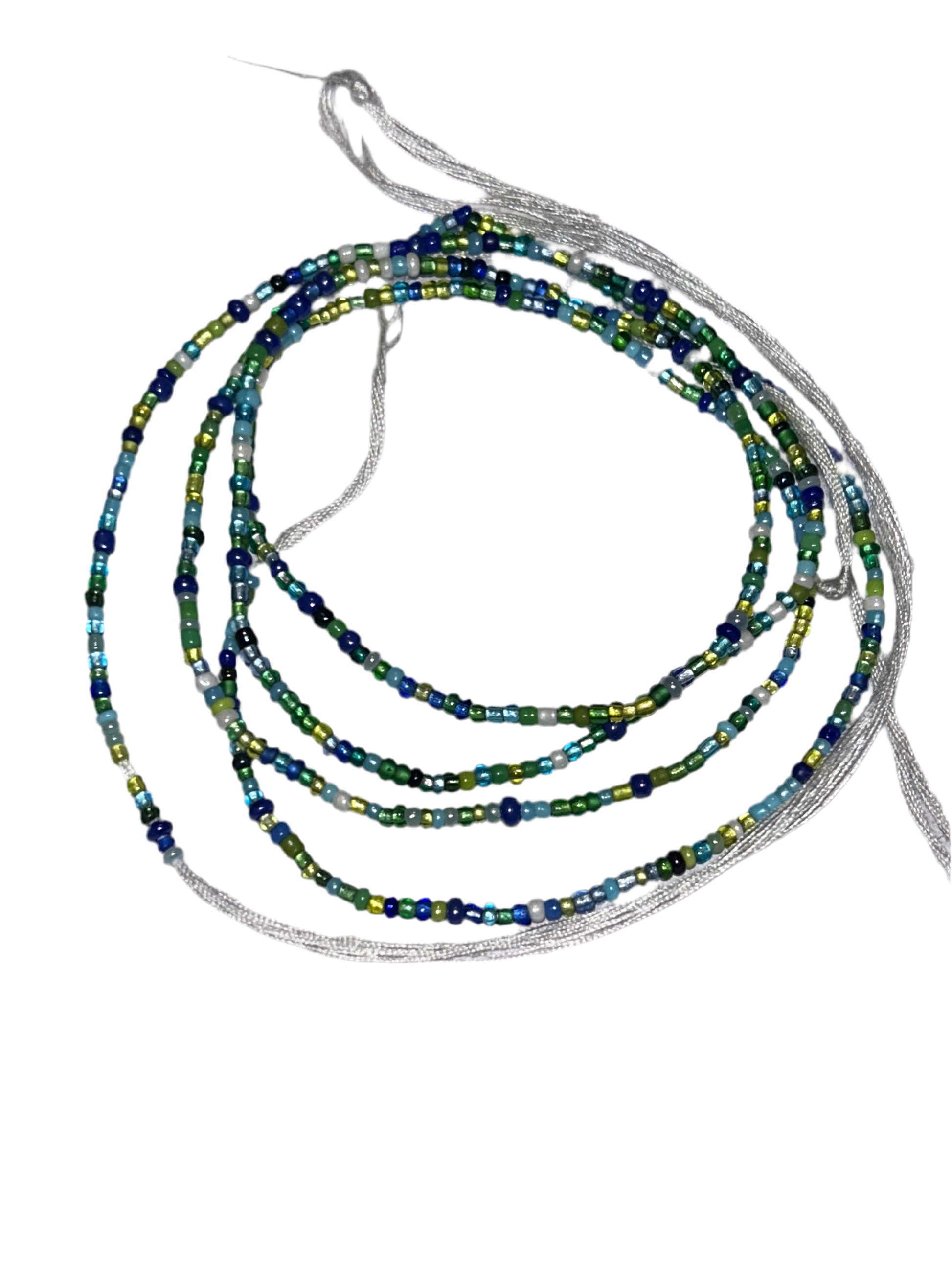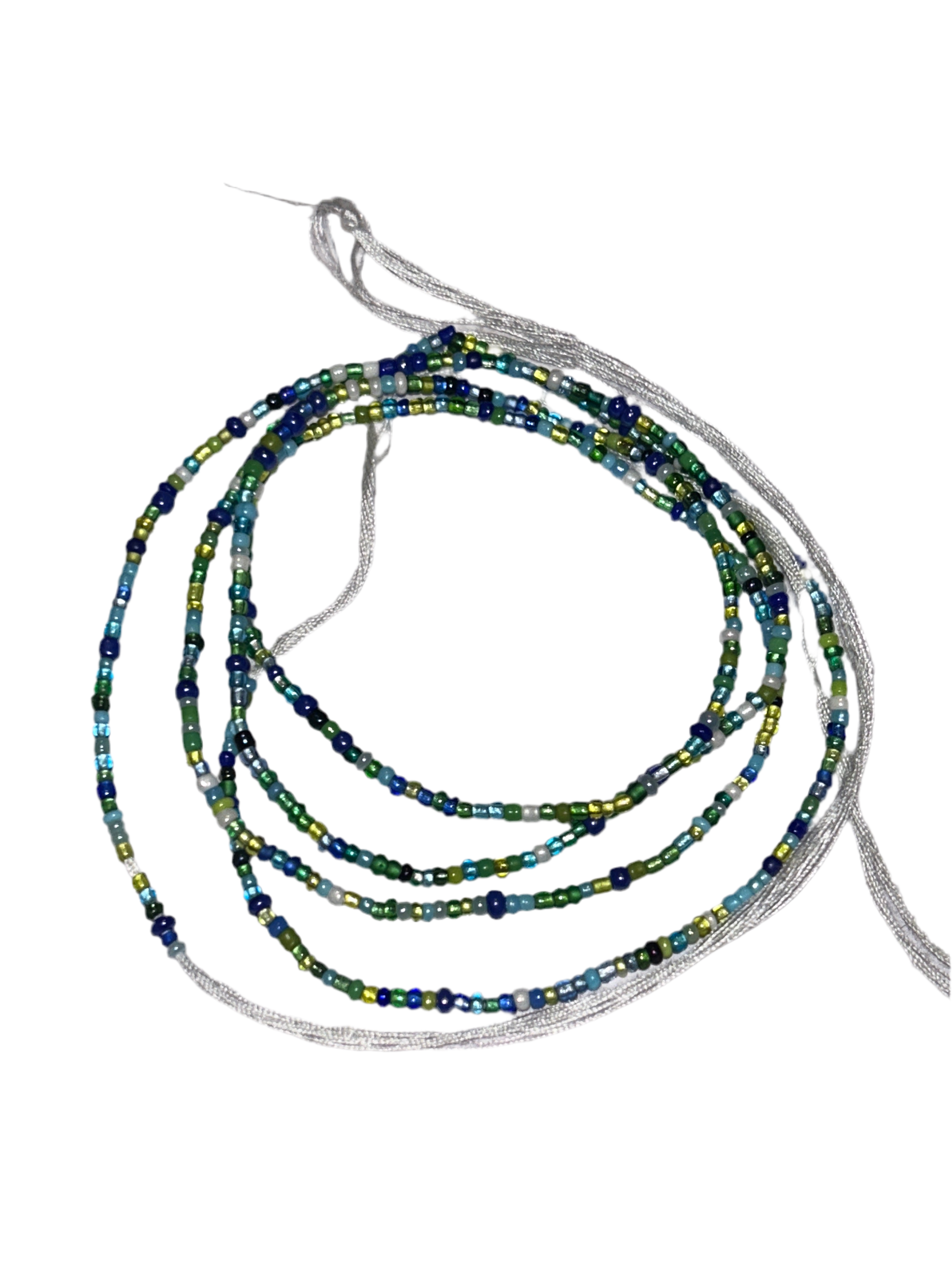 A mix of blue, white & green 2mm glass beads on cotton thread