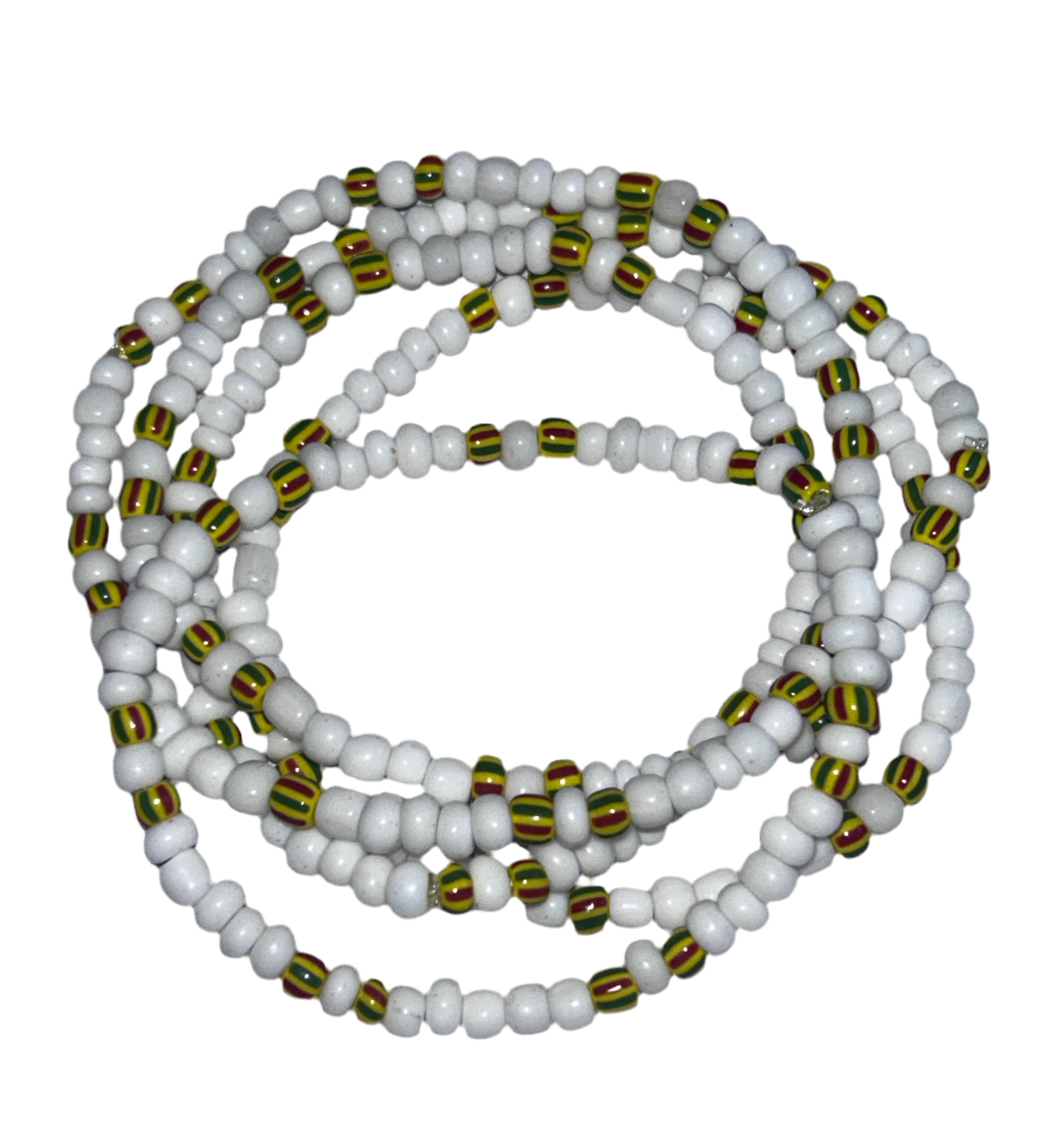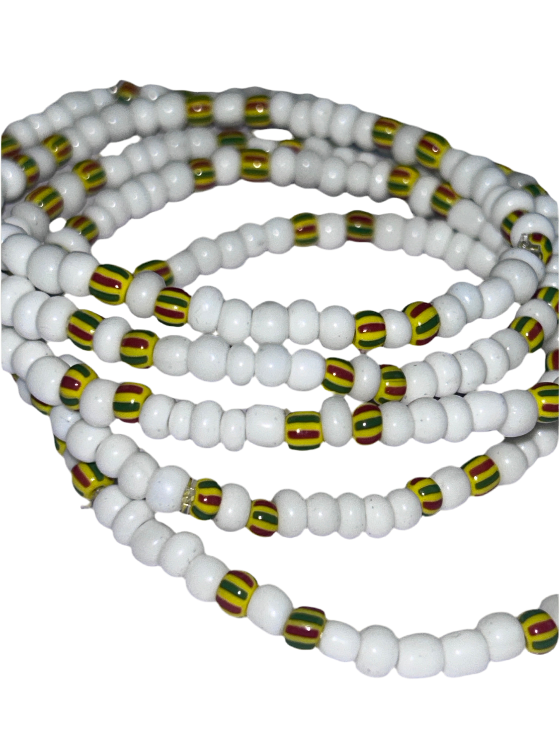White opaque glass sees beads with striped yellow, red and green bead on elastic thread